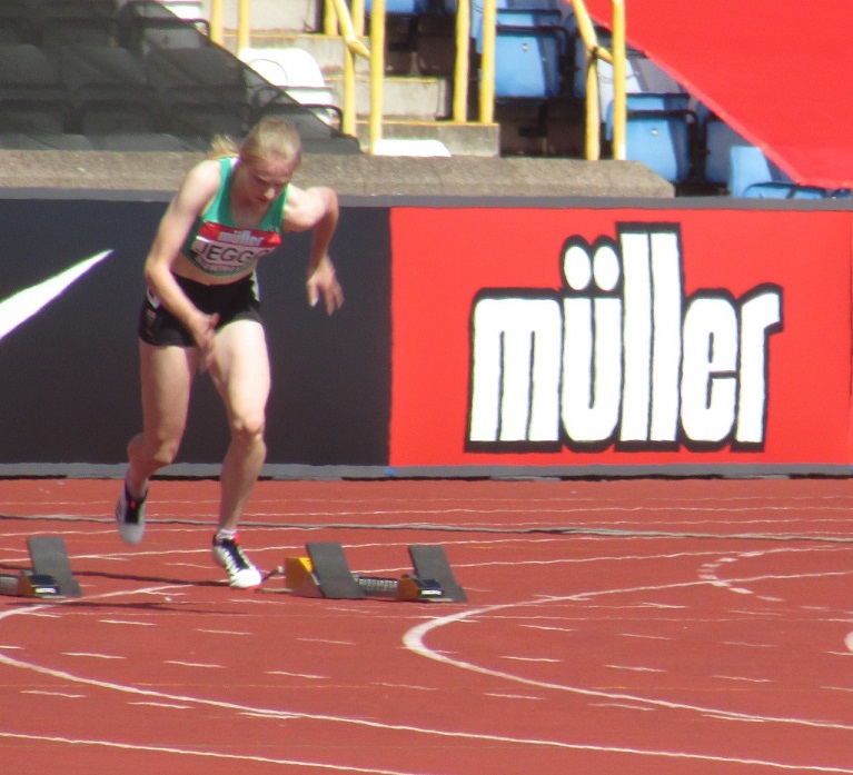 On the Saturday Jeggo had the honour of being the first track athlete to be announced to the crowd in the initial heat of 100m. Full of confidence from her recent success’s she was quickly into her running to take a strong second place in 11.92s, the fourth fastest time of the five heats.