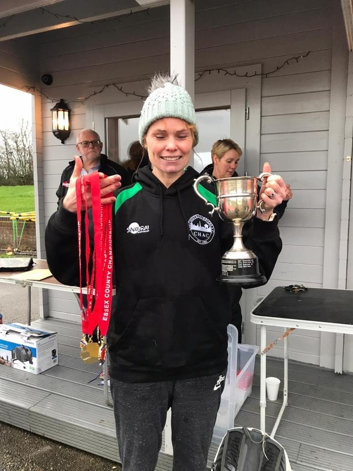 Colchester Harriers’ women picked up from where they left off in 2021 as they fought off close competition from both Havering AC and Victoria Park and Tower Hamlets AC to win the Ron Merrie Cup, the trophy awarded to the winners of the annual Essex County Cross-Country Championships. This year’s event, held at a wet and blustery Gloucester Park in Basildon, attracted a strong field from across the county, but saw Colchester’s teamwork pay off with all five of their runners finishing in the top 22. Lydia Callan led the way, with her sixth position finish also gaining her a place in the Essex team for the national inter-counties championships in Loughborough in March. Callan was backed up by strong runs from Victoria Primmer (14th), Emma Burgess (16th), Tracy English (21st) and Denise Morley (22nd) as Harriers took the trophy for the first time since 2011.
